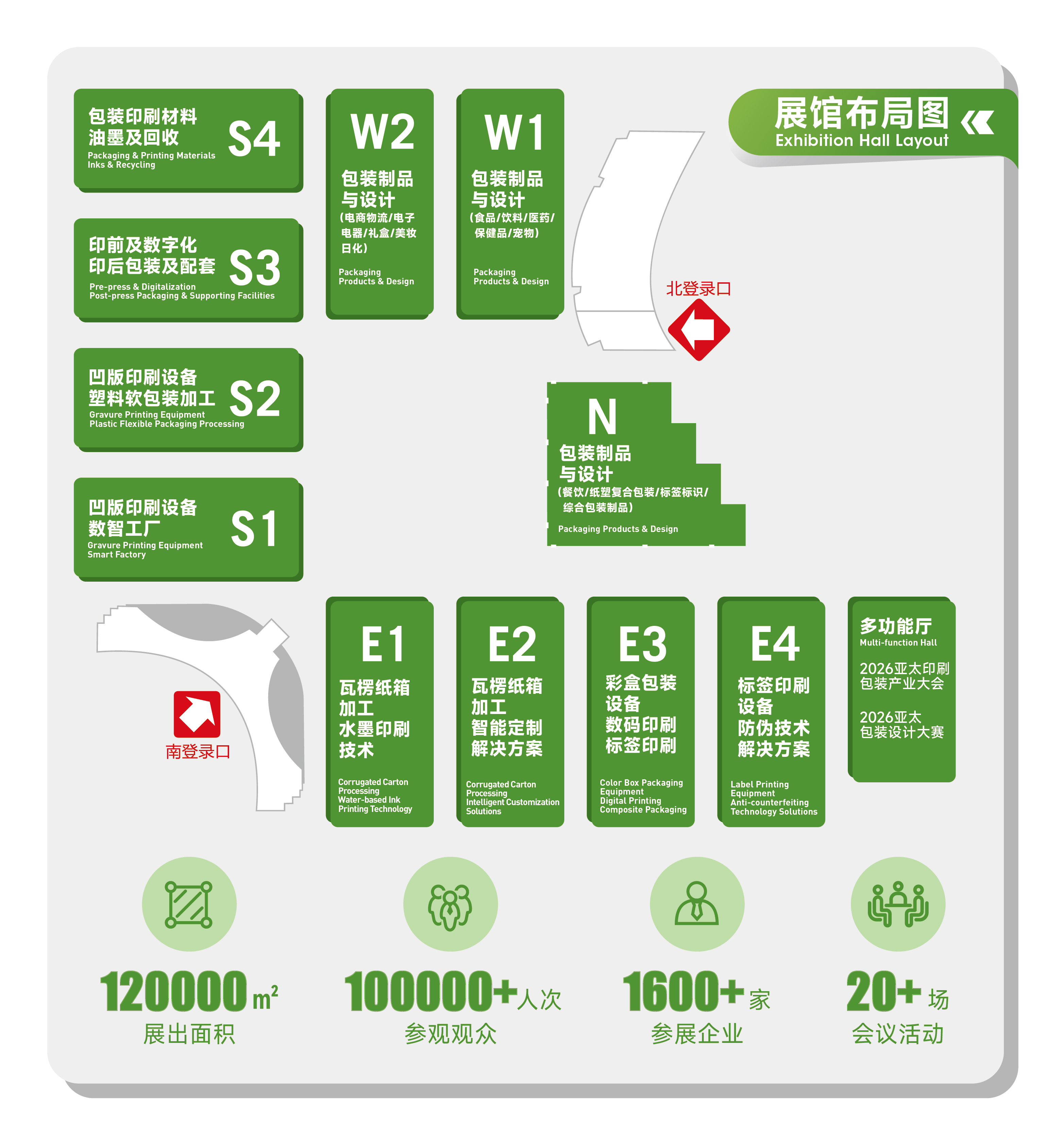 标准展厅数据介绍:十座大空间、无柱结构的单层标准展馆,单馆建筑面积约为12000平米,净展览面积近10000平米,可容纳约504个国际标准展位,展厅高18米、最低12米,地面荷载50KN/㎡
